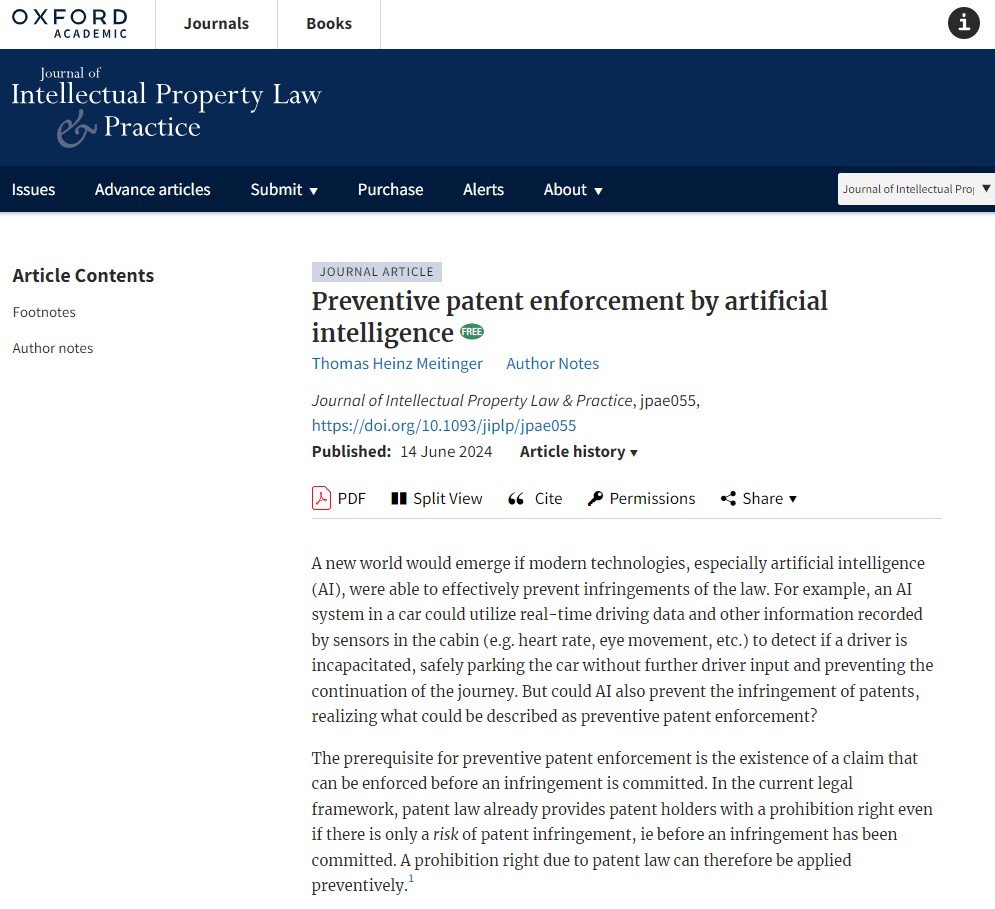 Dr. Meitinger beschreibt in dem Journal of Intellectual Property and Law die Möglichkeiten und Grenzen der präventiven Patentdurchsetzung mit einer Künstlichen Intelligenz.