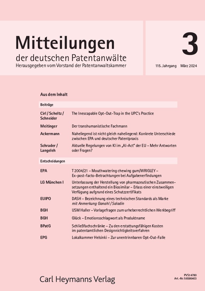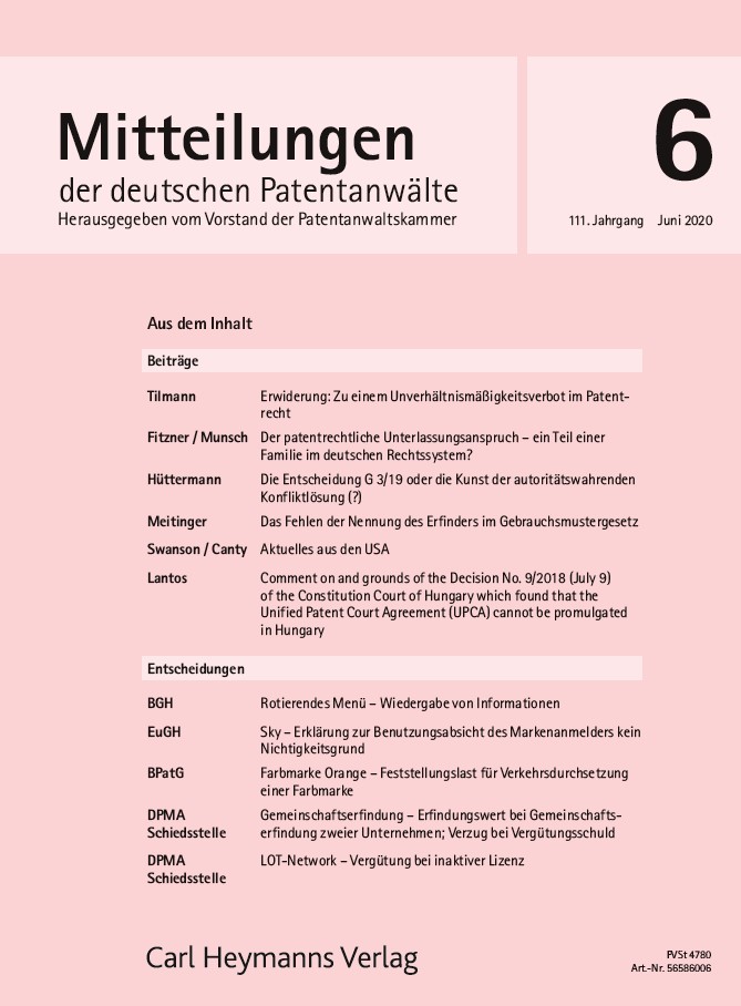 In der Juni-Ausgabe des Jahres 2024 weist Dr. Meitinger auf die Besonderheit hin, dass der Unterlassungsanspruch aus einem Patent von den Gründungsvätern des deutschen Patentgesetzes nicht gewollt war.