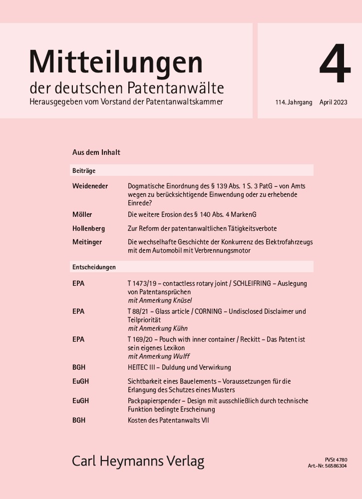Dr. Meitinger beschreibt in der Januar-Ausgabe des Jahres 2023 die Möglichkeiten, Änderungen an den Anmeldeunterlagen im Erteilungsverfahren vor dem Europäischen Patentamt, insbesondere zur Vorbereitung einer mündlichen Verhandlung, vorzunehmen.